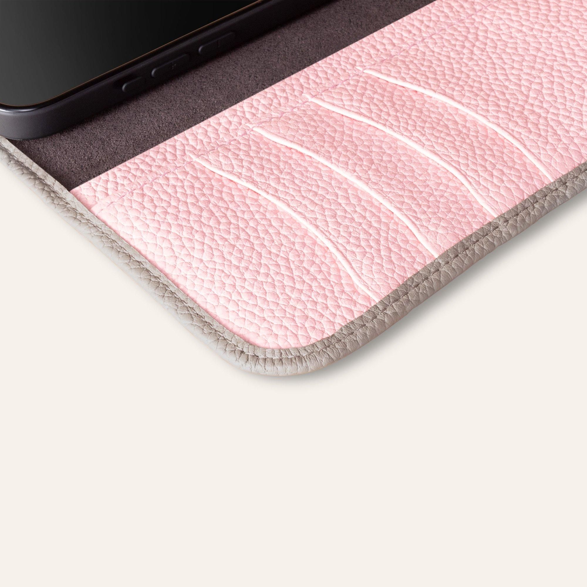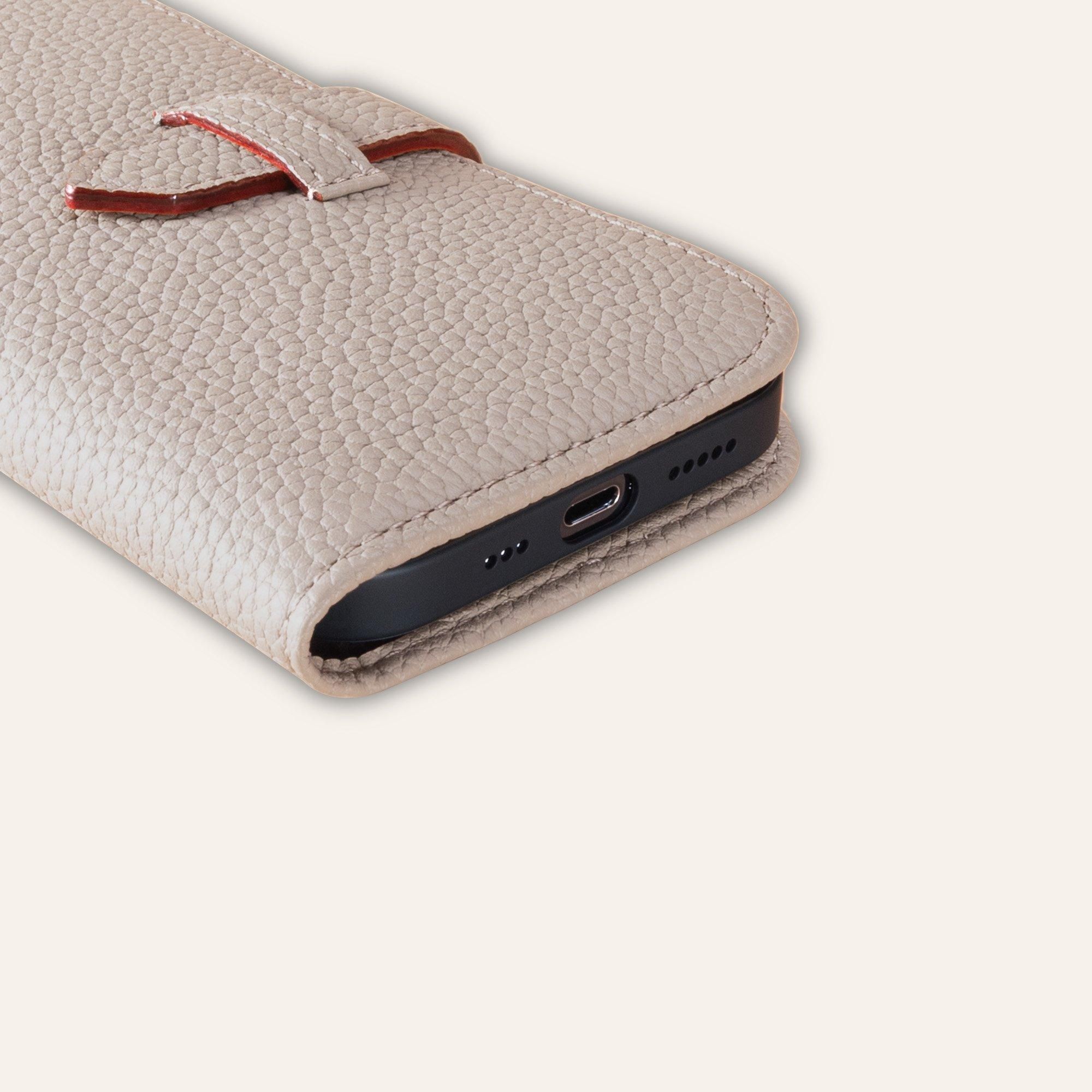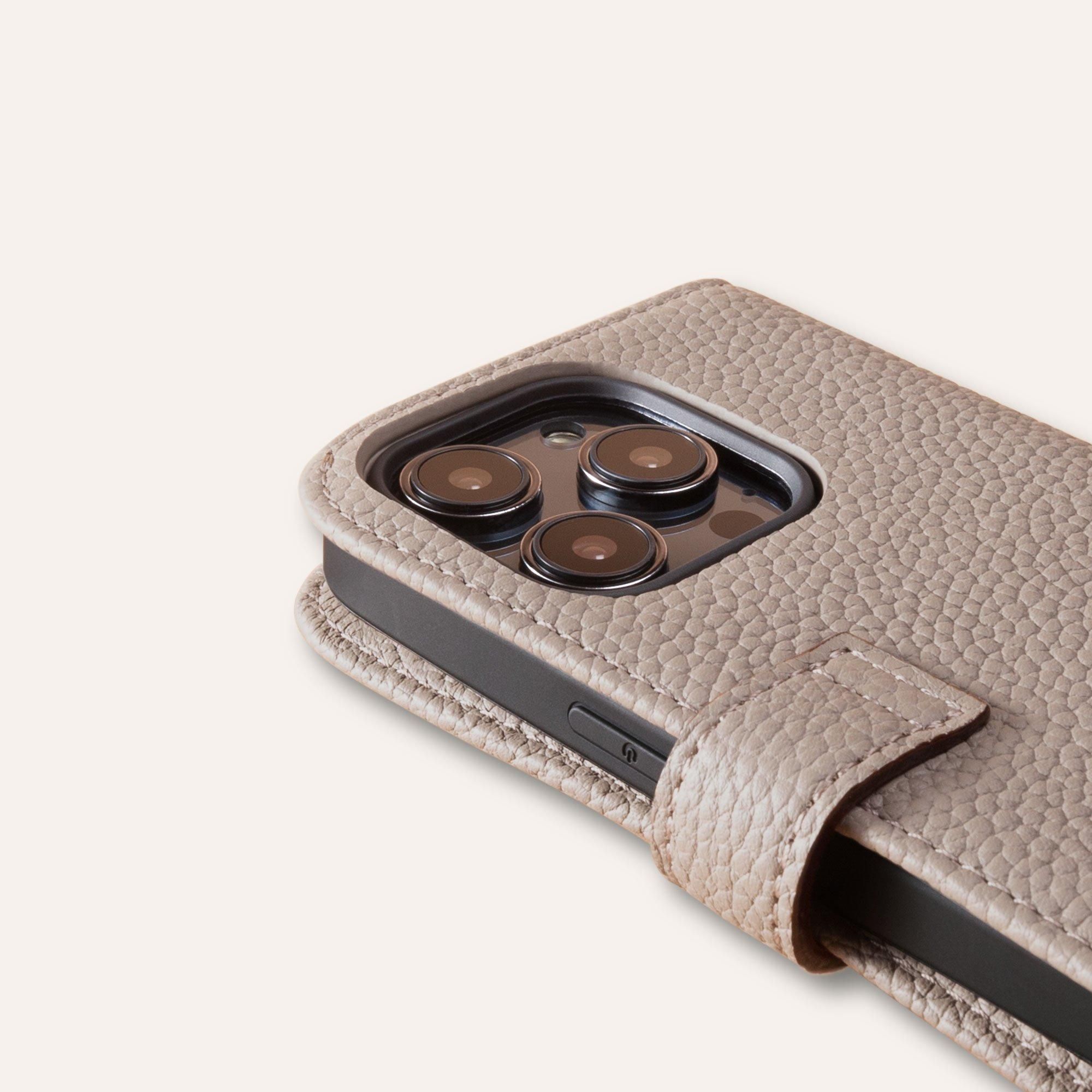 iPhone本体と収納したカード等への影響を考慮して、マグネットを一切使用せず、伝統的な差し込みタイプのベルトを採用しました。クラシックな手帳のようにお楽しみいただけます。