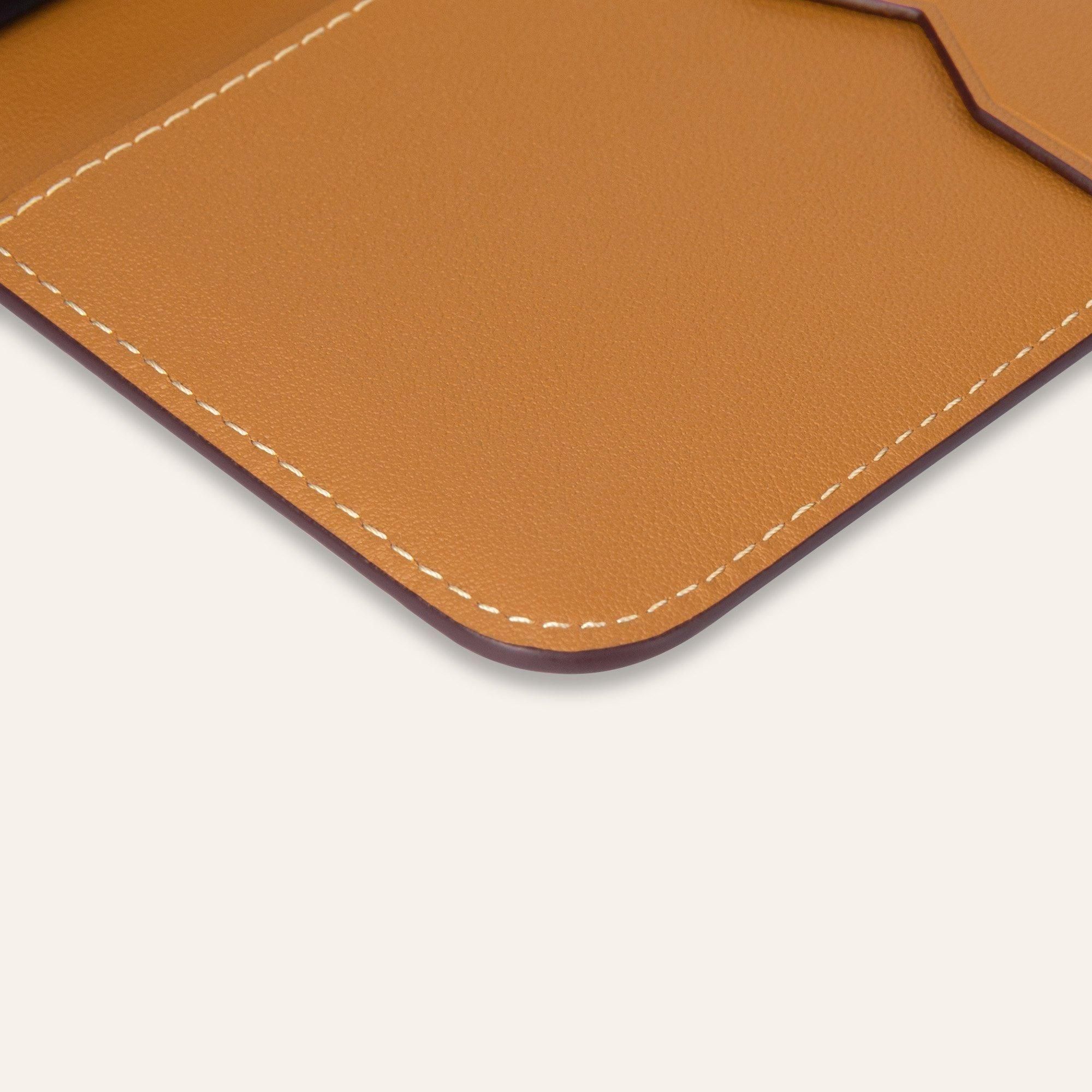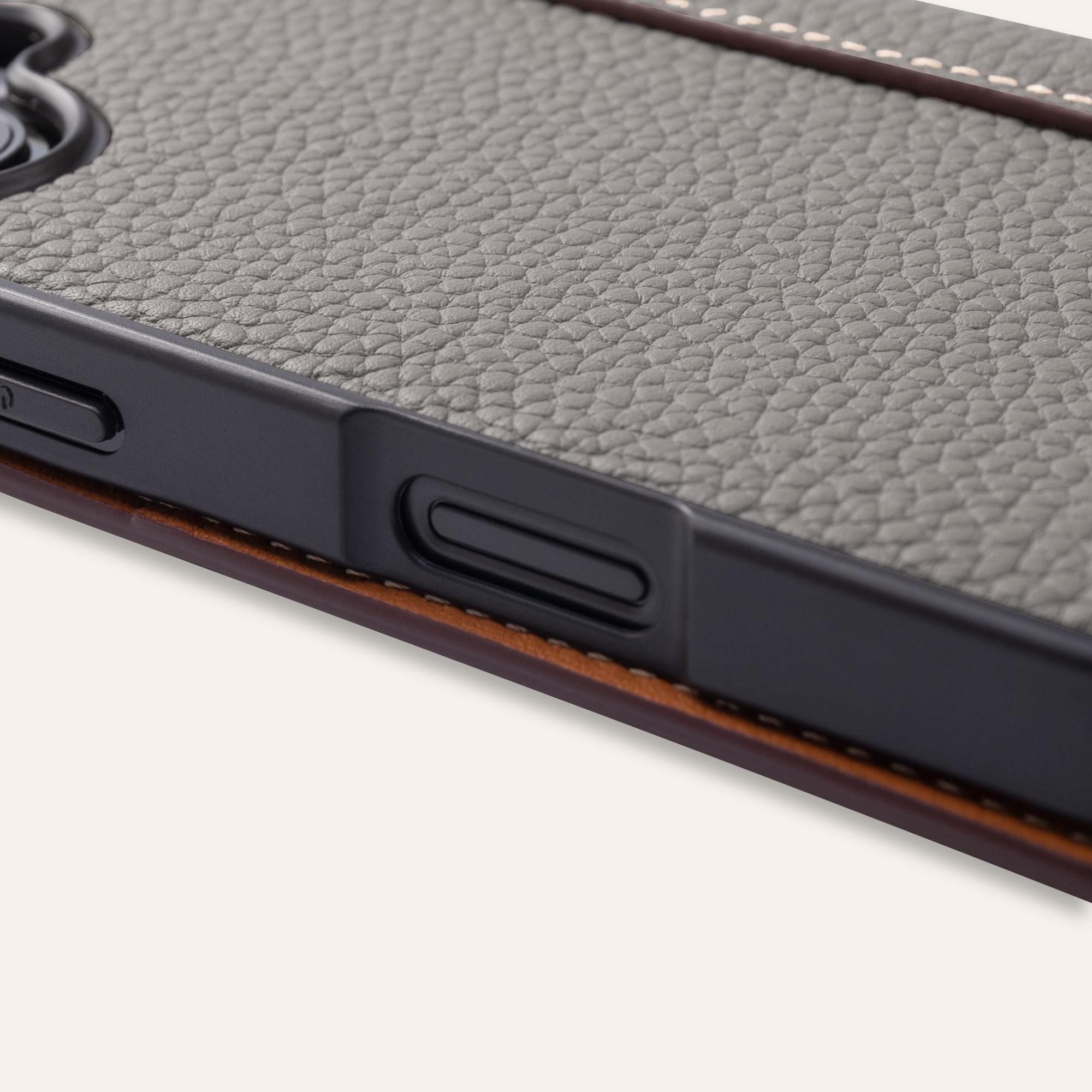 ヨーロッパの高級ブランドがこぞって採用している「シュリンクカーフレザー」と滑らかな触り心地の「スムースレザー」を組み合わせた、エレガントなiPhoneケースです。上質な天然皮革が手にしっくり馴染み、贅沢な使い心地をお楽しみいただけます。