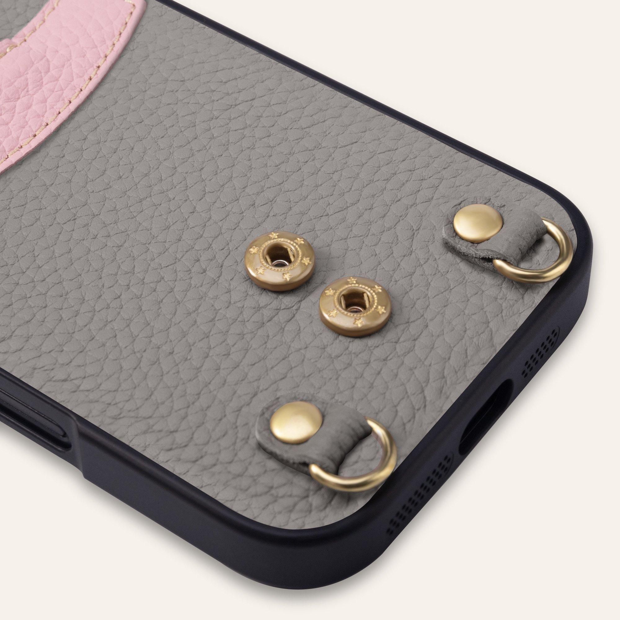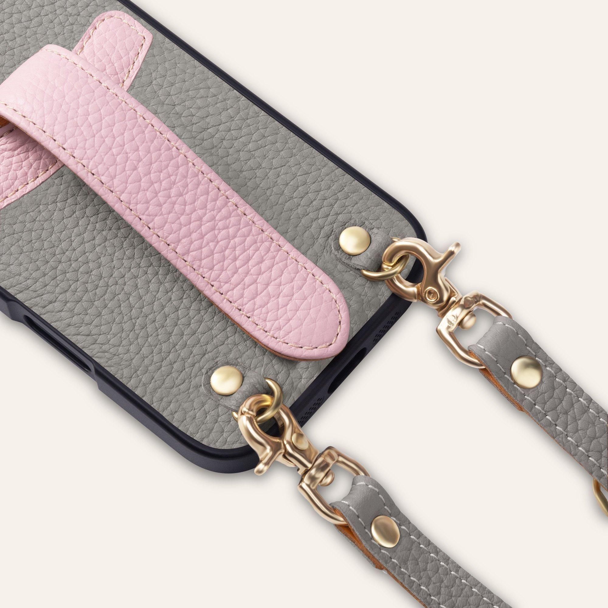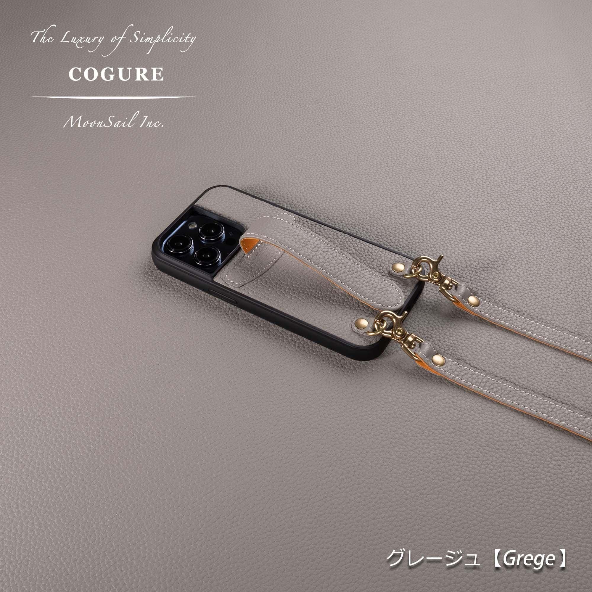 【 C O G U R E 】が独自考案したユニークな落下防止ベルトは、スナップボタンで簡単にサイズ調整ができます。ベルトがケースの中央に配置され、左右どちらからも違和感なく持てます。ベルトの表側はシュリンクカーフレザー、裏側はスムースレザーを使用しており、柔らかく滑らかな触り心地を実現しています。