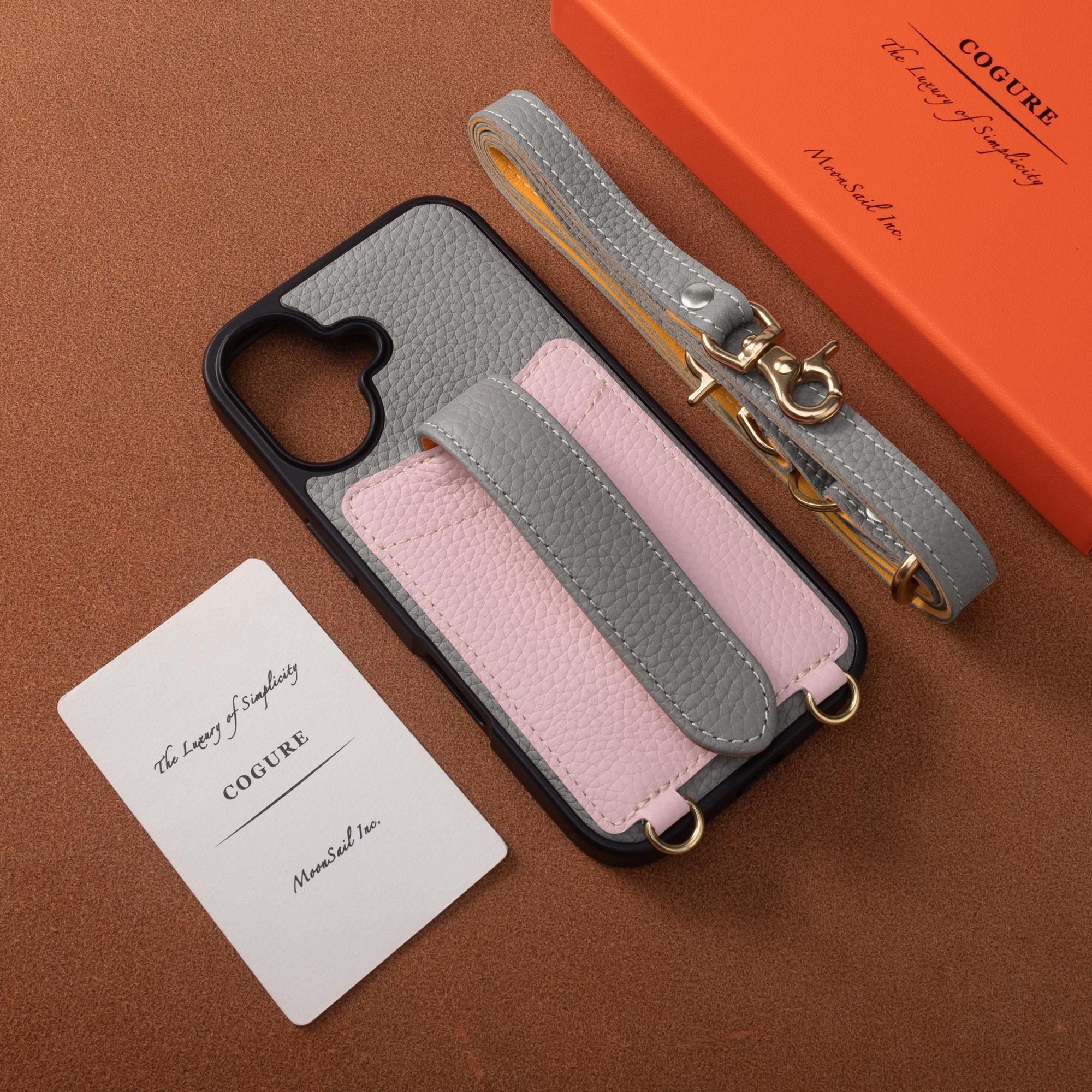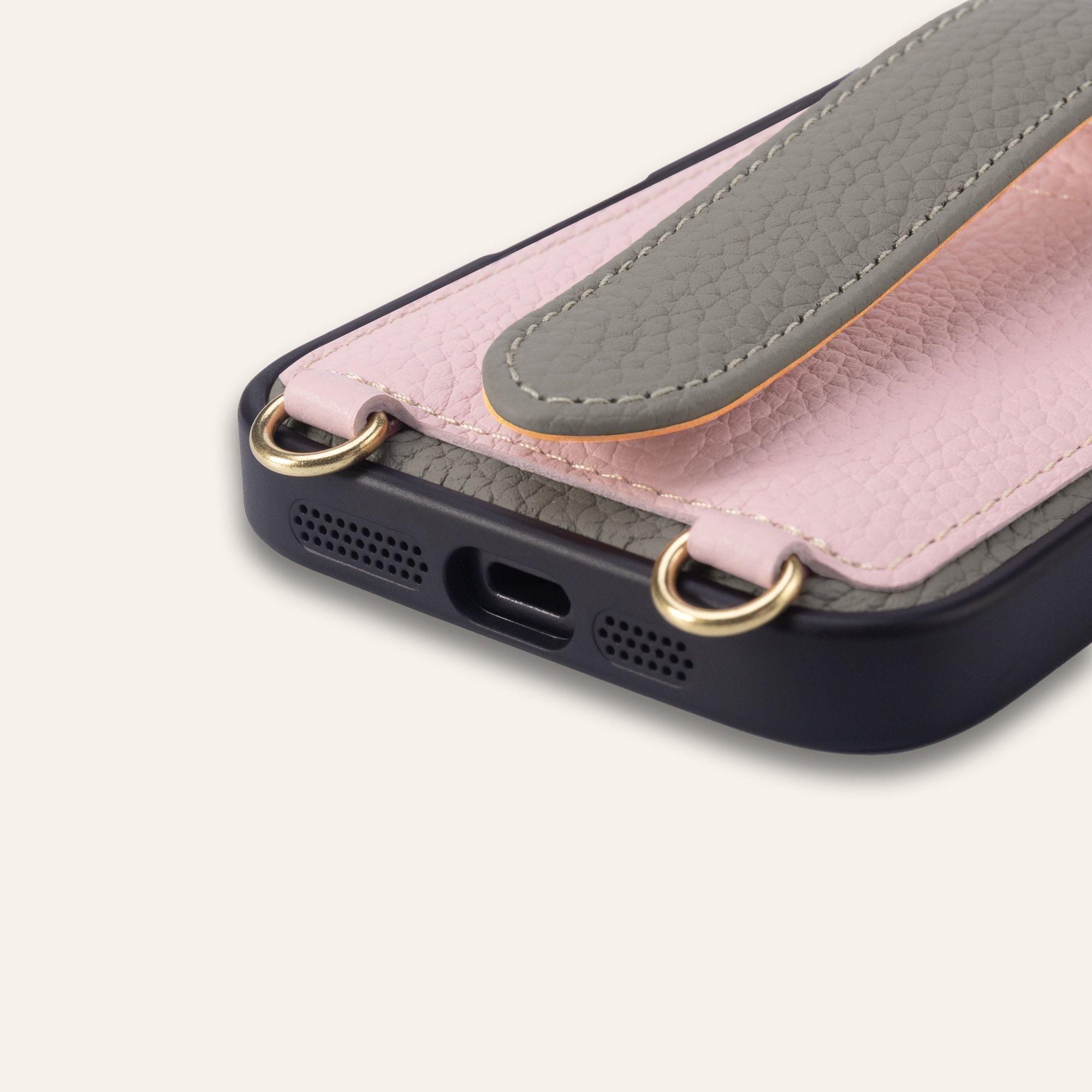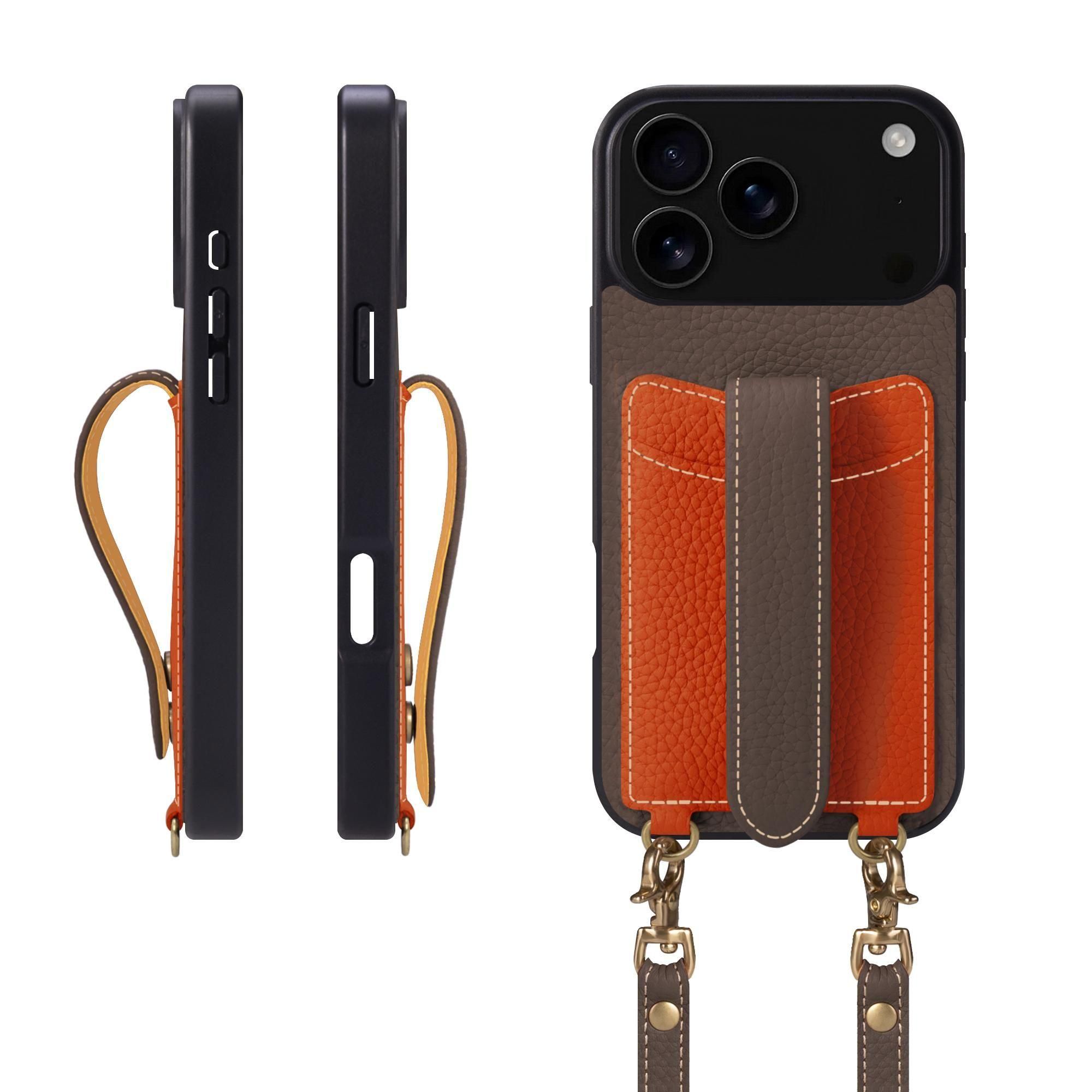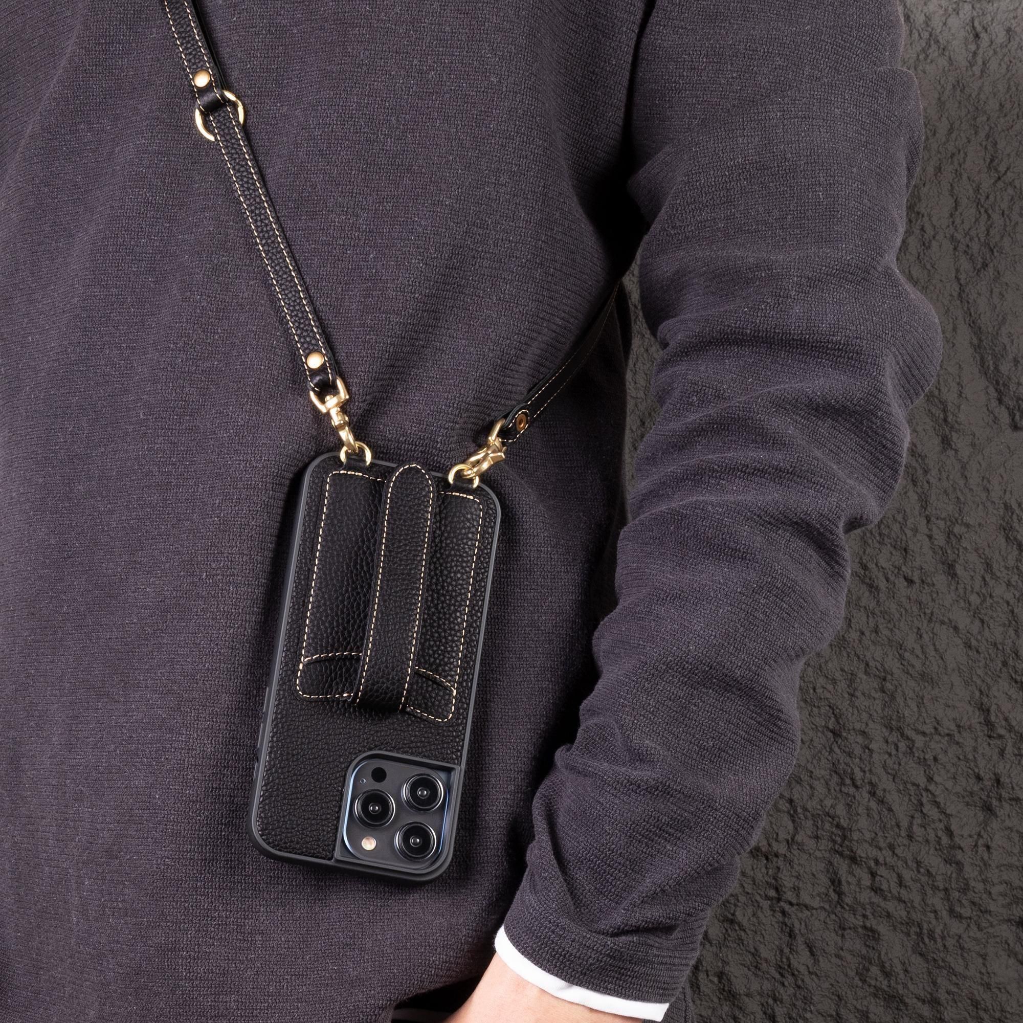 】が独自考案したユニークな落下防止ベルトは、スナップボタンで簡単にサイズ調整ができます。ベルトがケースの中央に配置され、左右どちらからも違和感なく持てます。ベルトの表側はシュリンクカーフレザー、裏側はスムースレザーを使用しており、柔らかく滑らかな触り心地を実現しています。