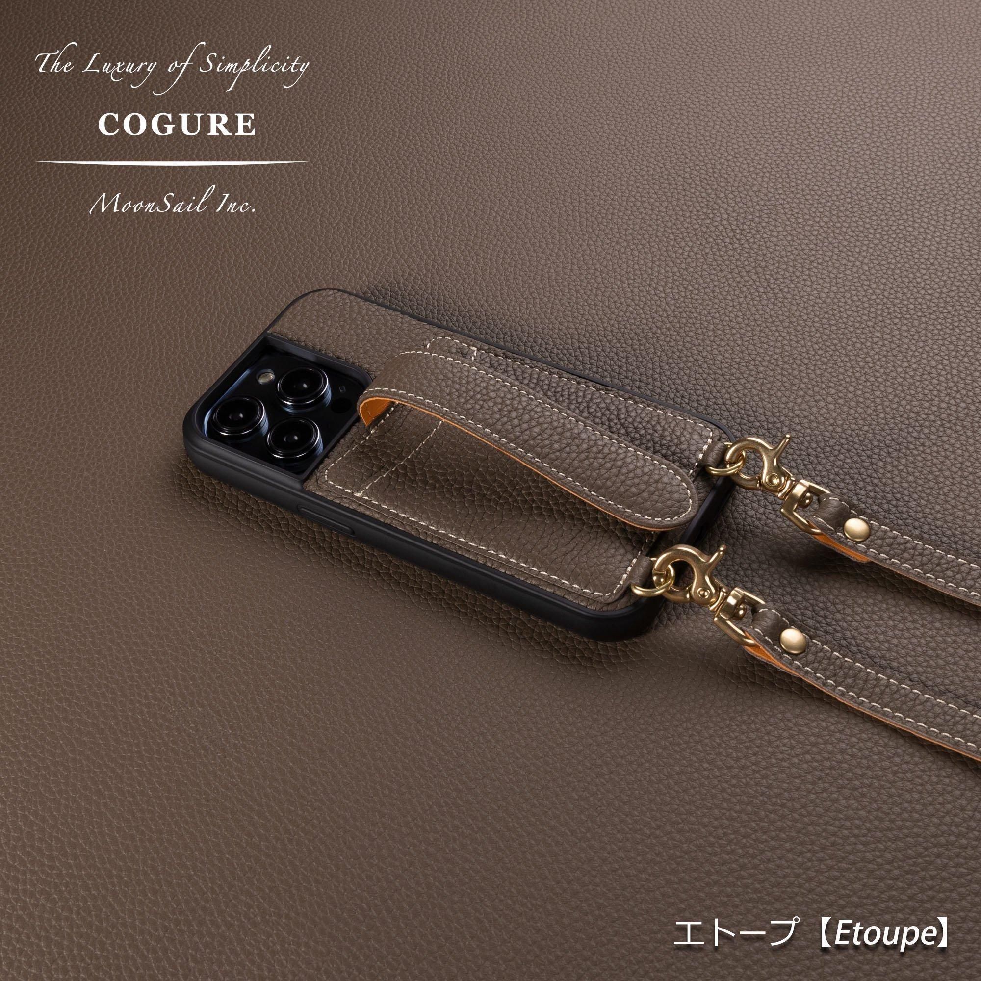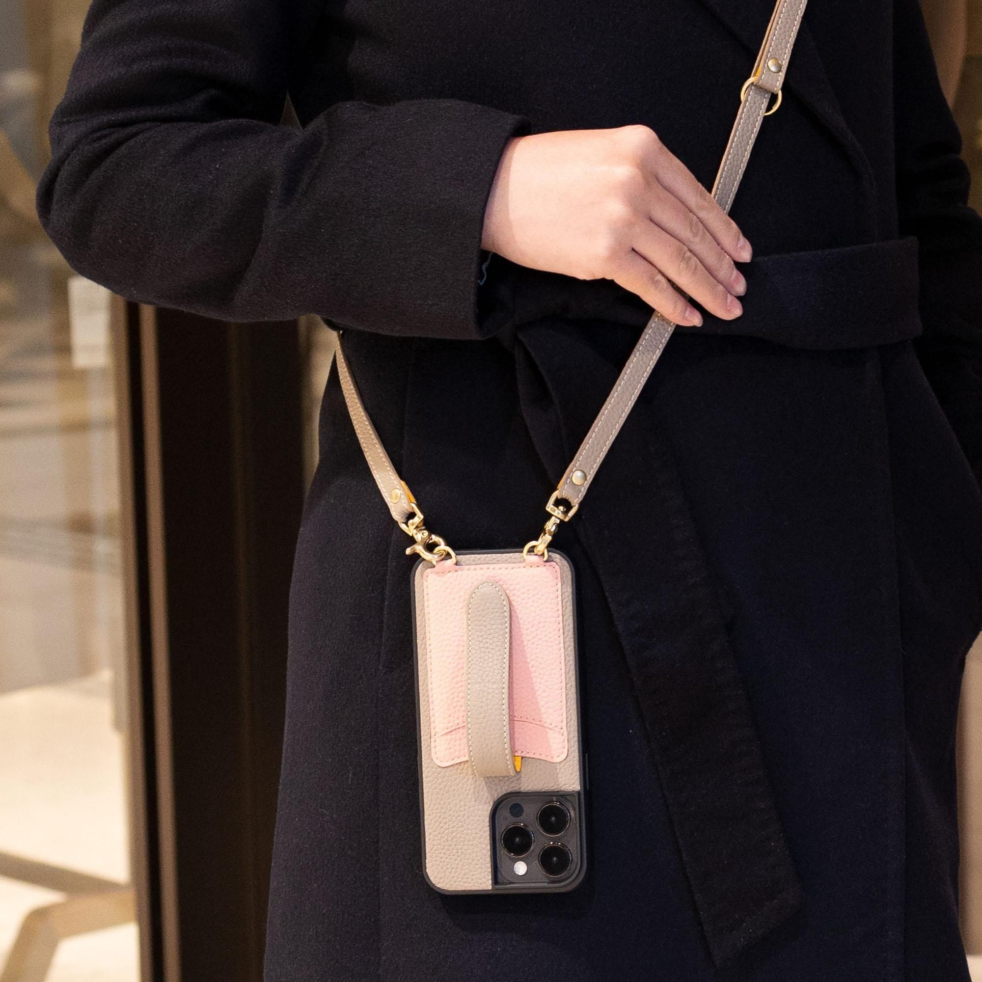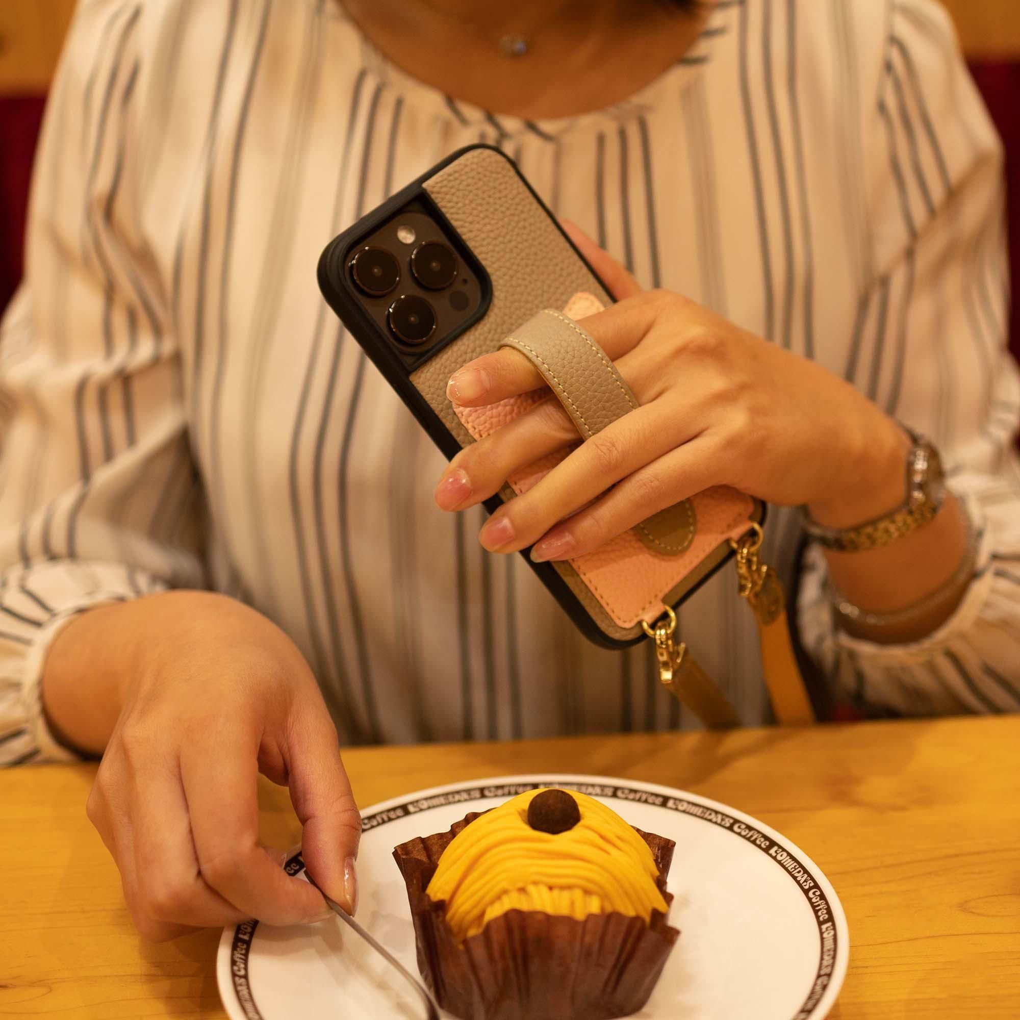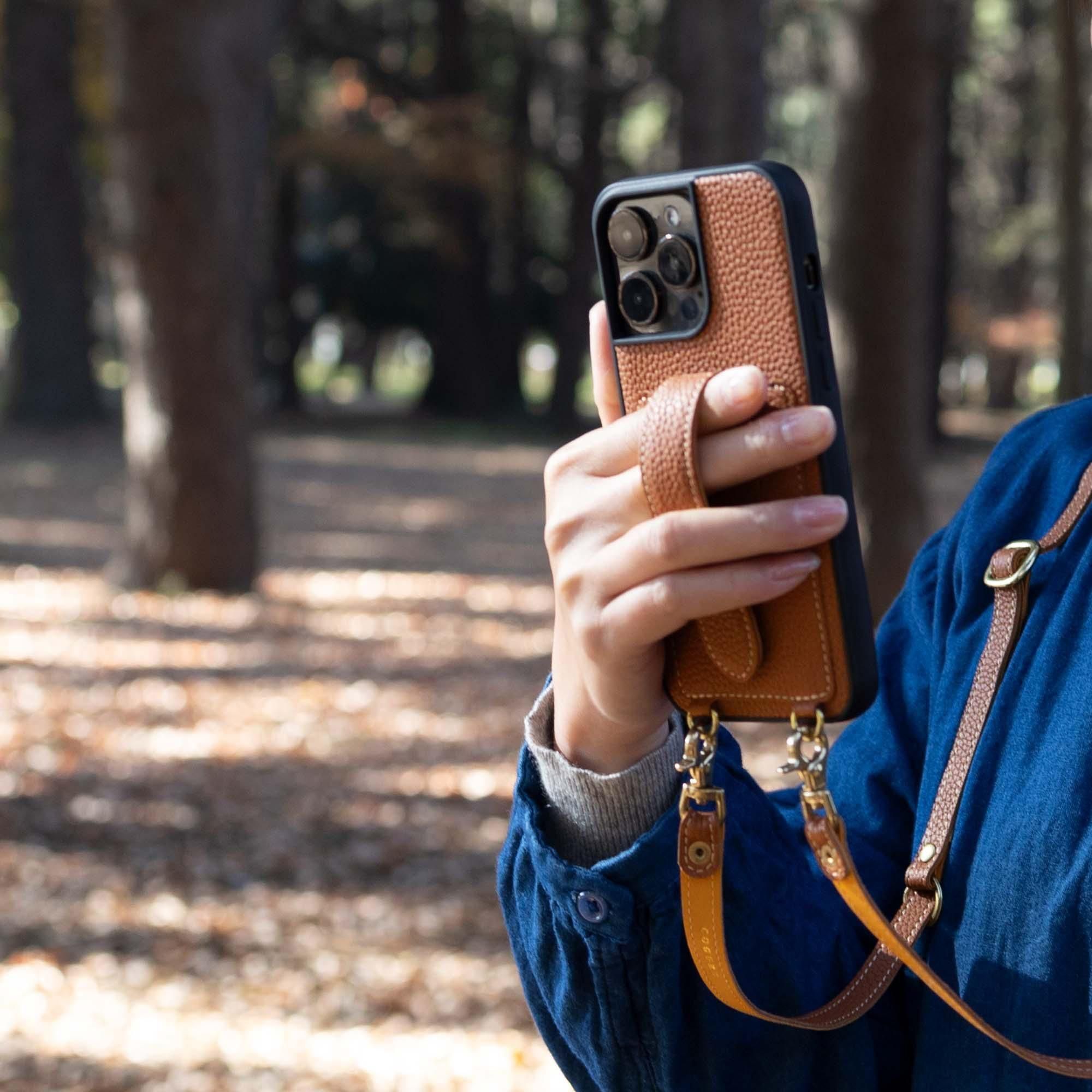 【 C O G U R E 】が独自考案したユニークな落下防止ベルトは、スナップボタンで簡単にサイズ調整ができます。ベルトがケースの中央に配置され、左右どちらからも違和感なく持てます。ベルトの表側はシュリンクカーフレザー、裏側はスムースレザーを使用しており、柔らかく滑らかな触り心地を実現しています。