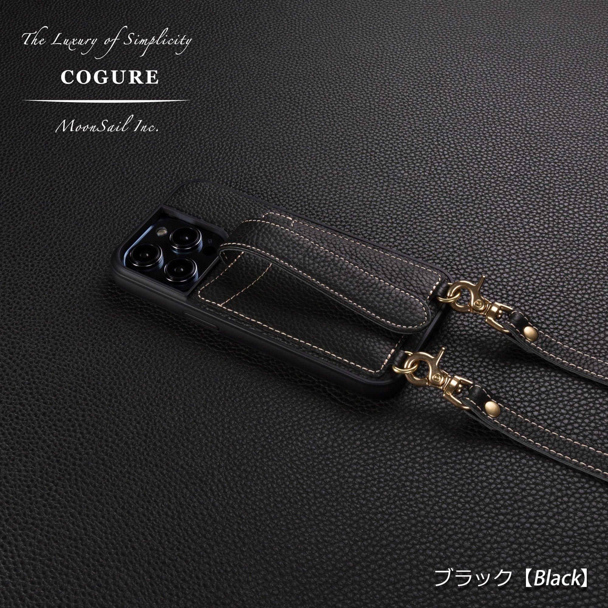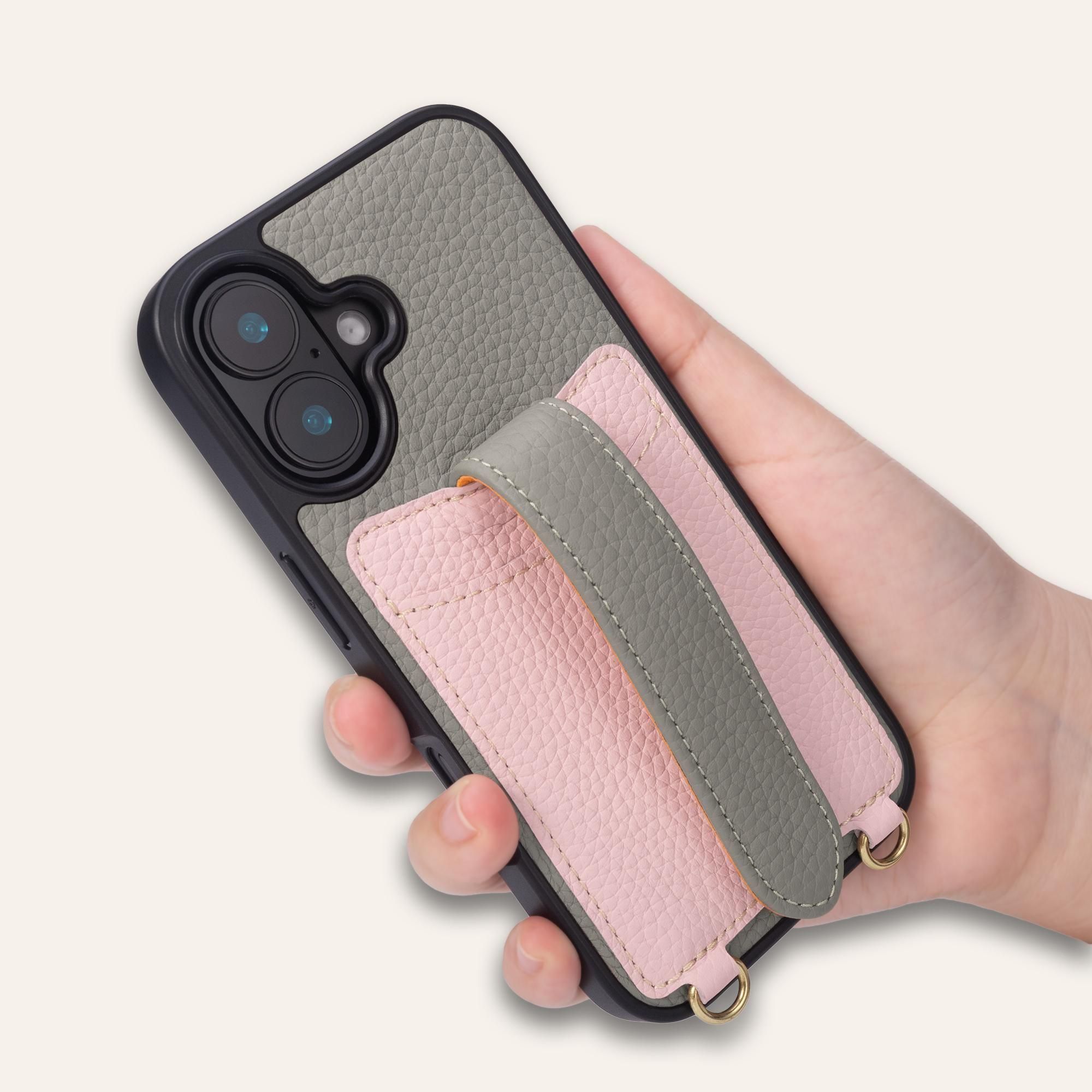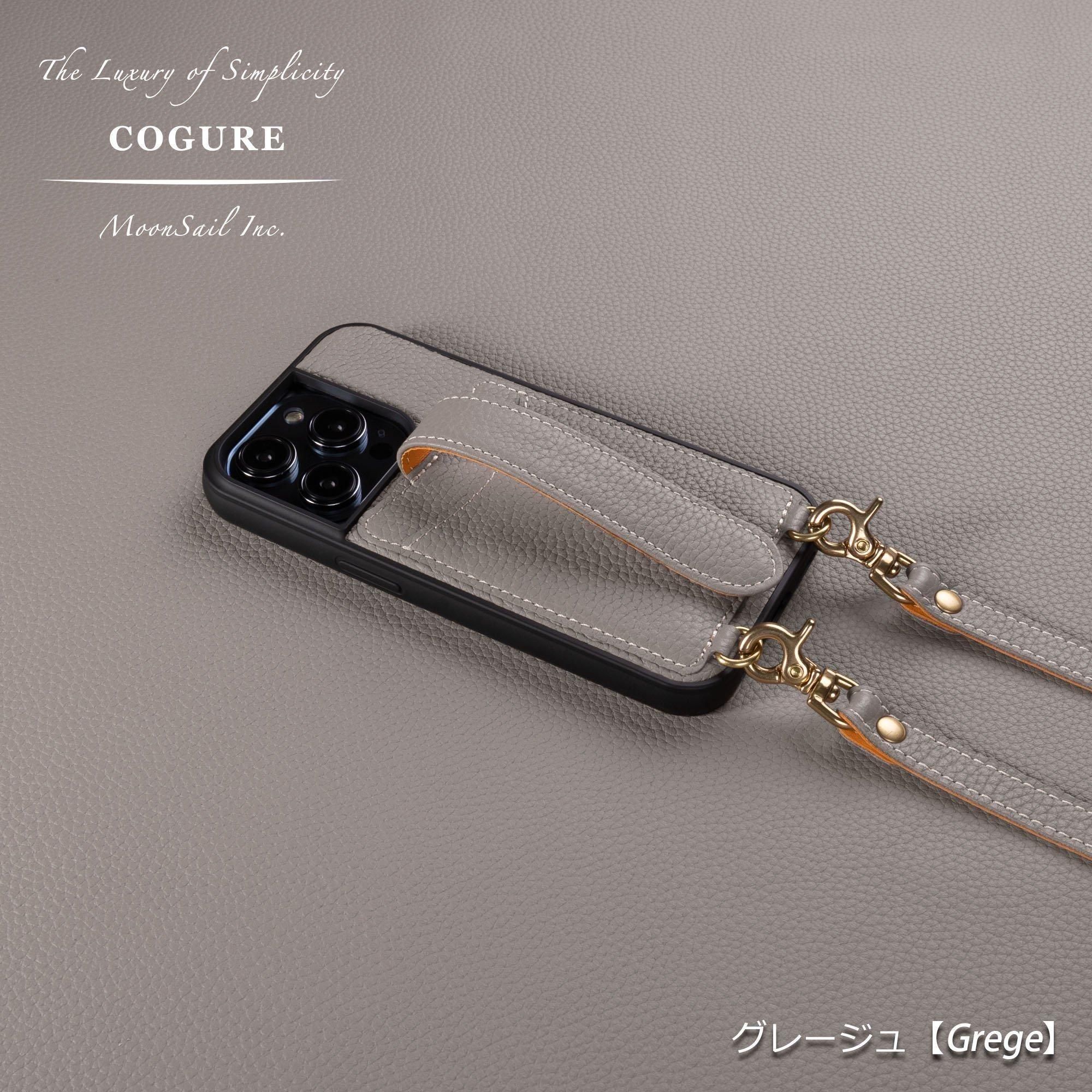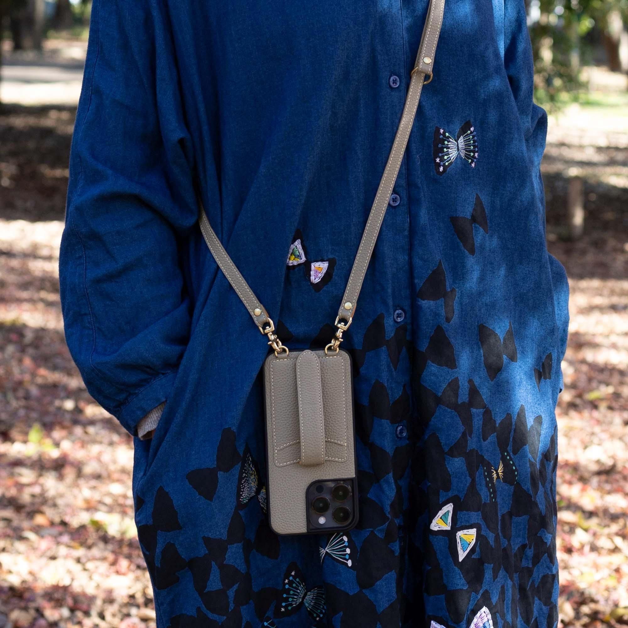 【 C O G U R E 】が独自考案したユニークな落下防止ベルトは、スナップボタンで簡単にサイズ調整ができます。ベルトがケースの中央に配置され、左右どちらからも違和感なく持てます。ベルトの表側はシュリンクカーフレザー、裏側はスムースレザーを使用しており、柔らかく滑らかな触り心地を実現しています。
