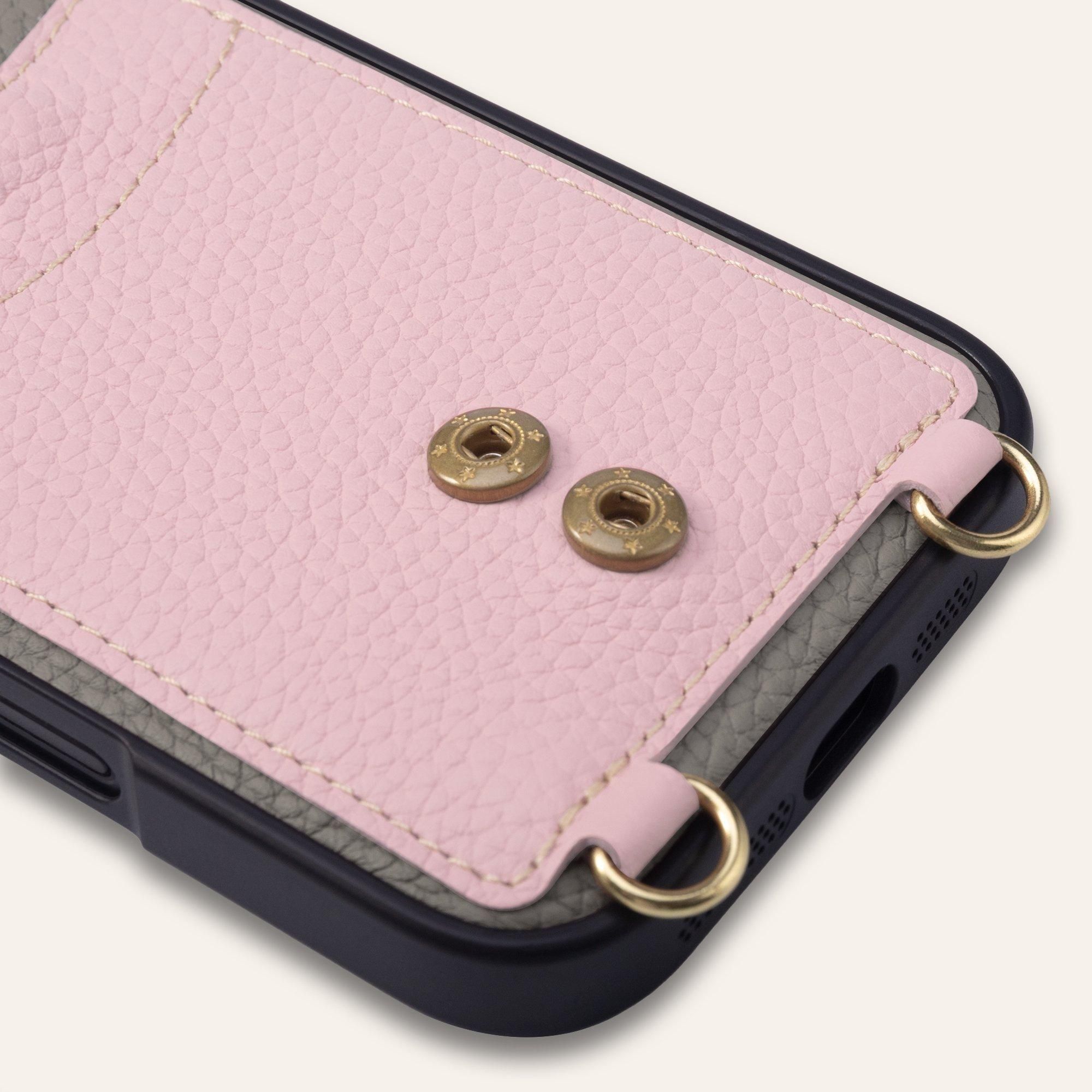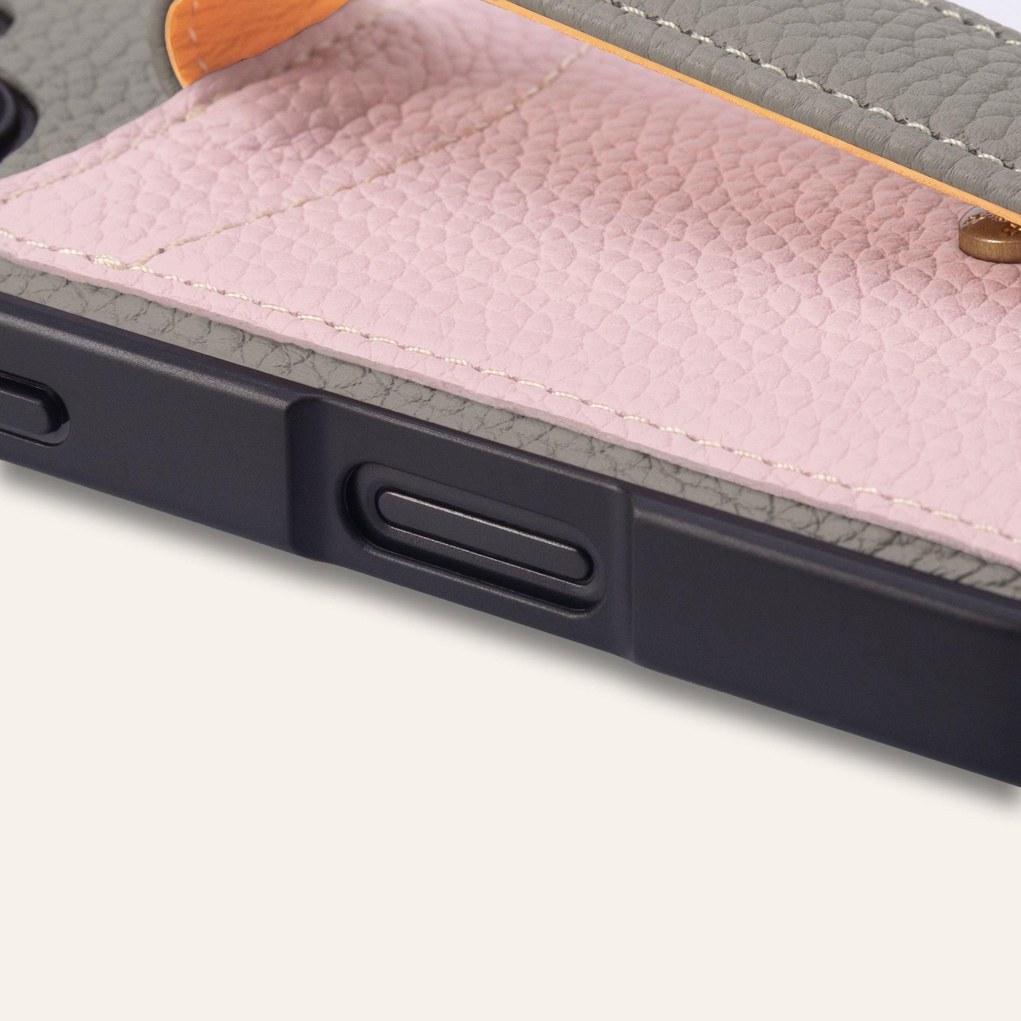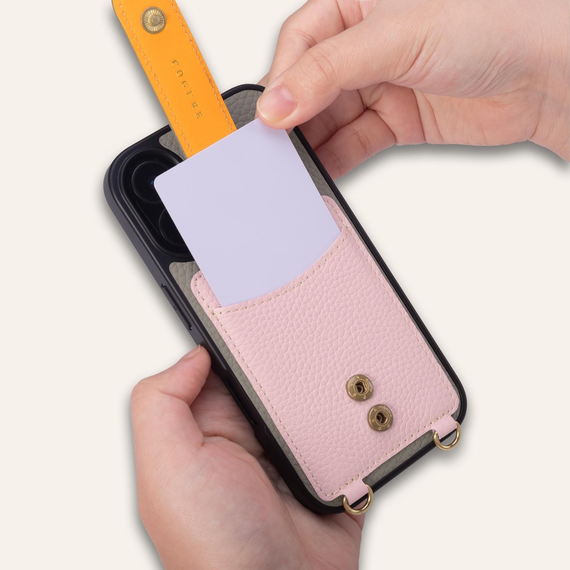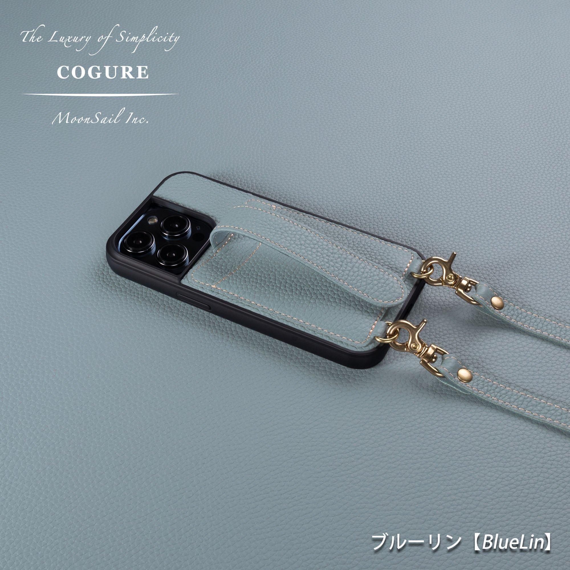 【 C O G U R E 】が独自考案したユニークな落下防止ベルトは、スナップボタンで簡単にサイズ調整ができます。ベルトがケースの中央に配置され、左右どちらからも違和感なく持てます。ベルトの表側はシュリンクカーフレザー、裏側はスムースレザーを使用しており、柔らかく滑らかな触り心地を実現しています。