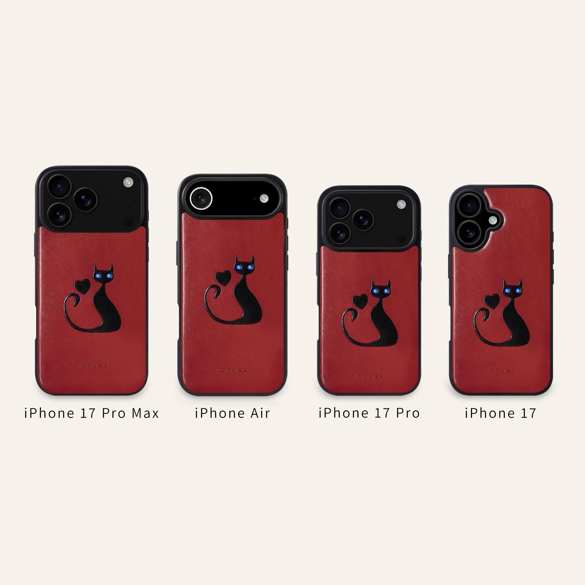 滑らかなイタリアンサドルレザーをベースに、ハートと猫のシルエットが精緻にデザインされた、遊び心あふれる逸品です。猫の瞳には、ダイヤモンド加工が施されたブルーサファイア宝飾ガラスをあしらい、高級感と華やかさを演出。どの角度から見ても美しく、持つたびに心を癒してくれる特別なiPhoneケースです。優雅で愛らしい魅力が、日常に彩りを加えます。
