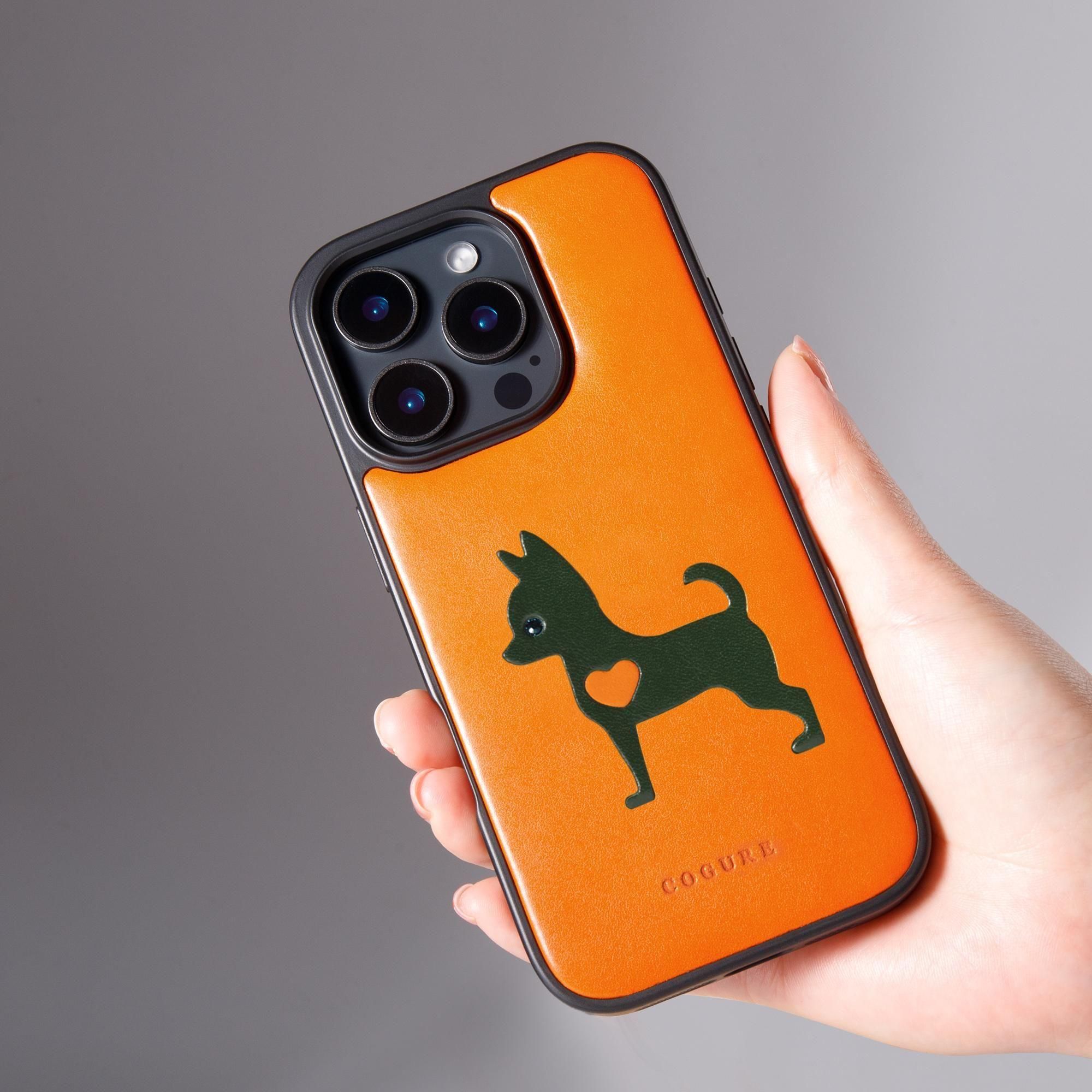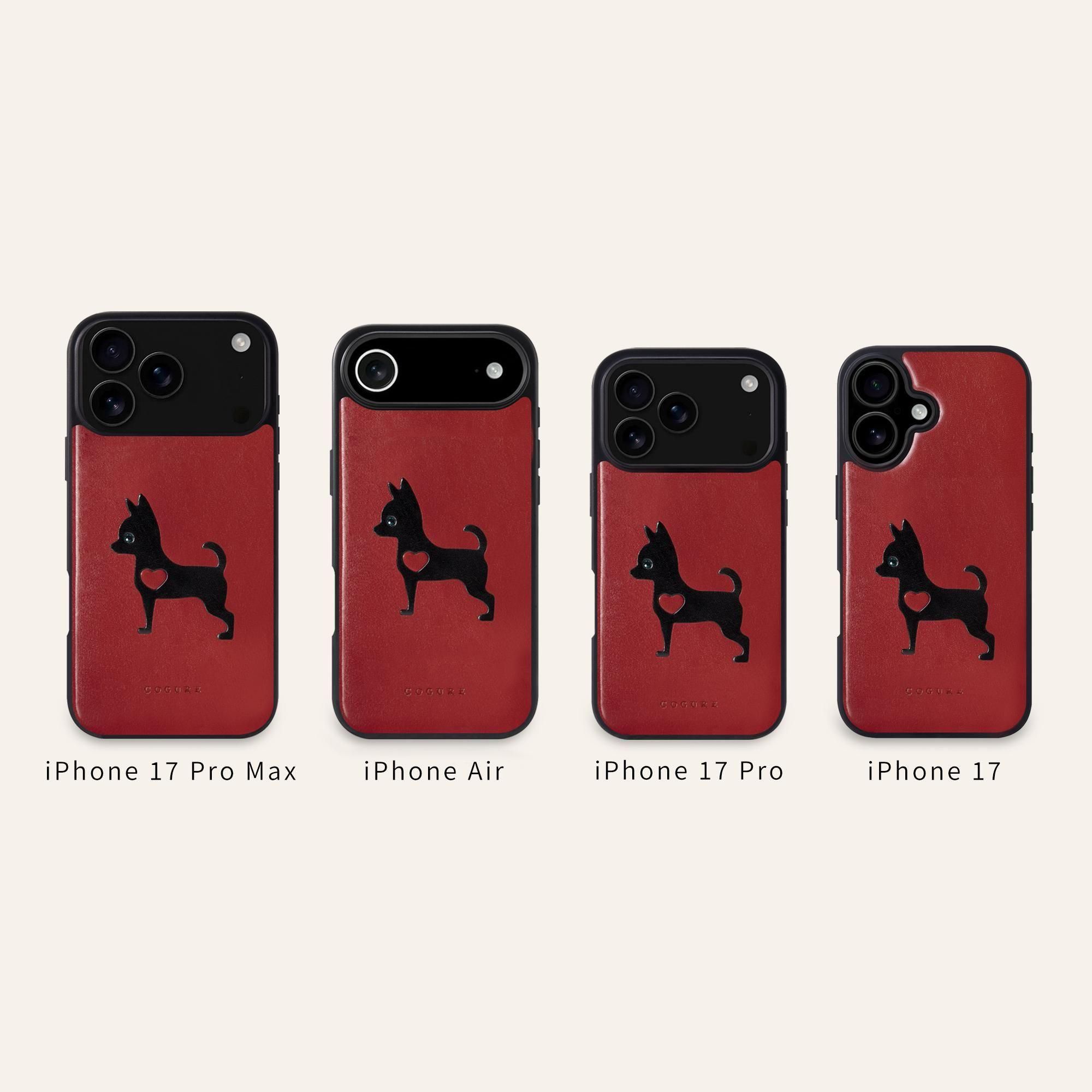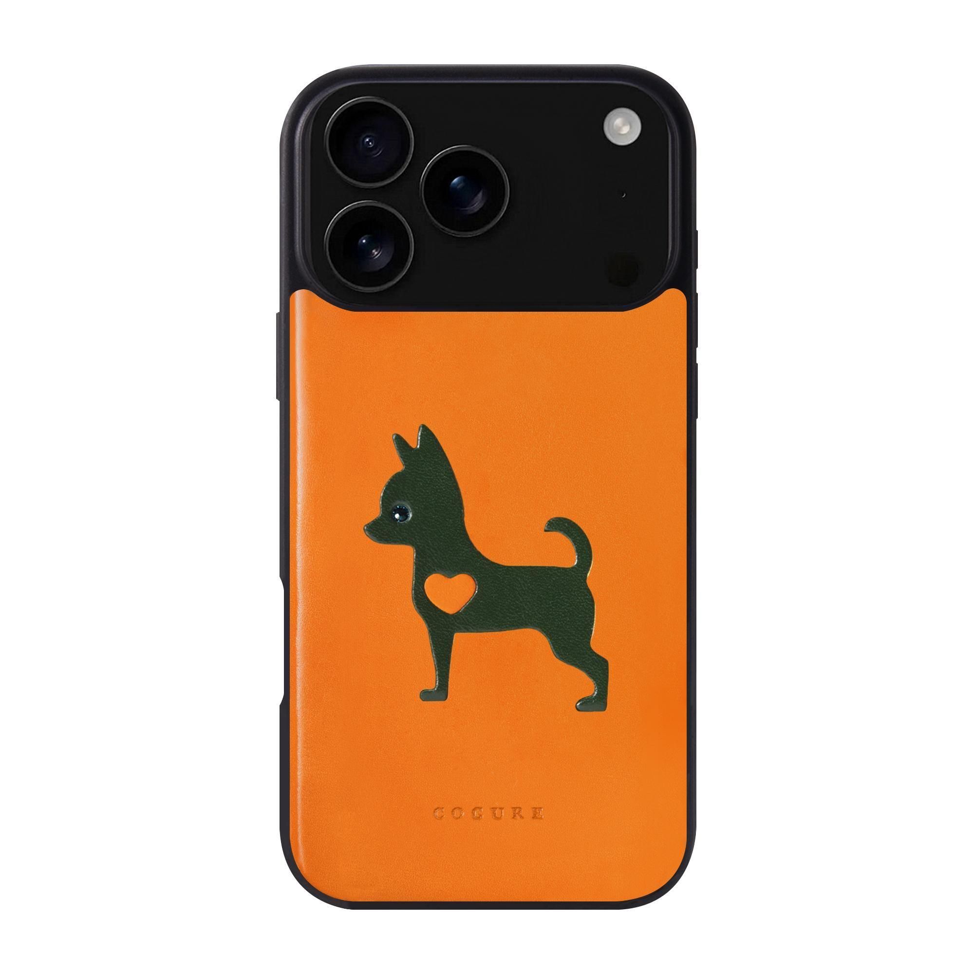 COTChi iPhone 17 Pro Max バックカバーケース イタリアンサドルレザー & ダイヤモンド加工モンタナサファイア宝飾ガラス チワワ柄