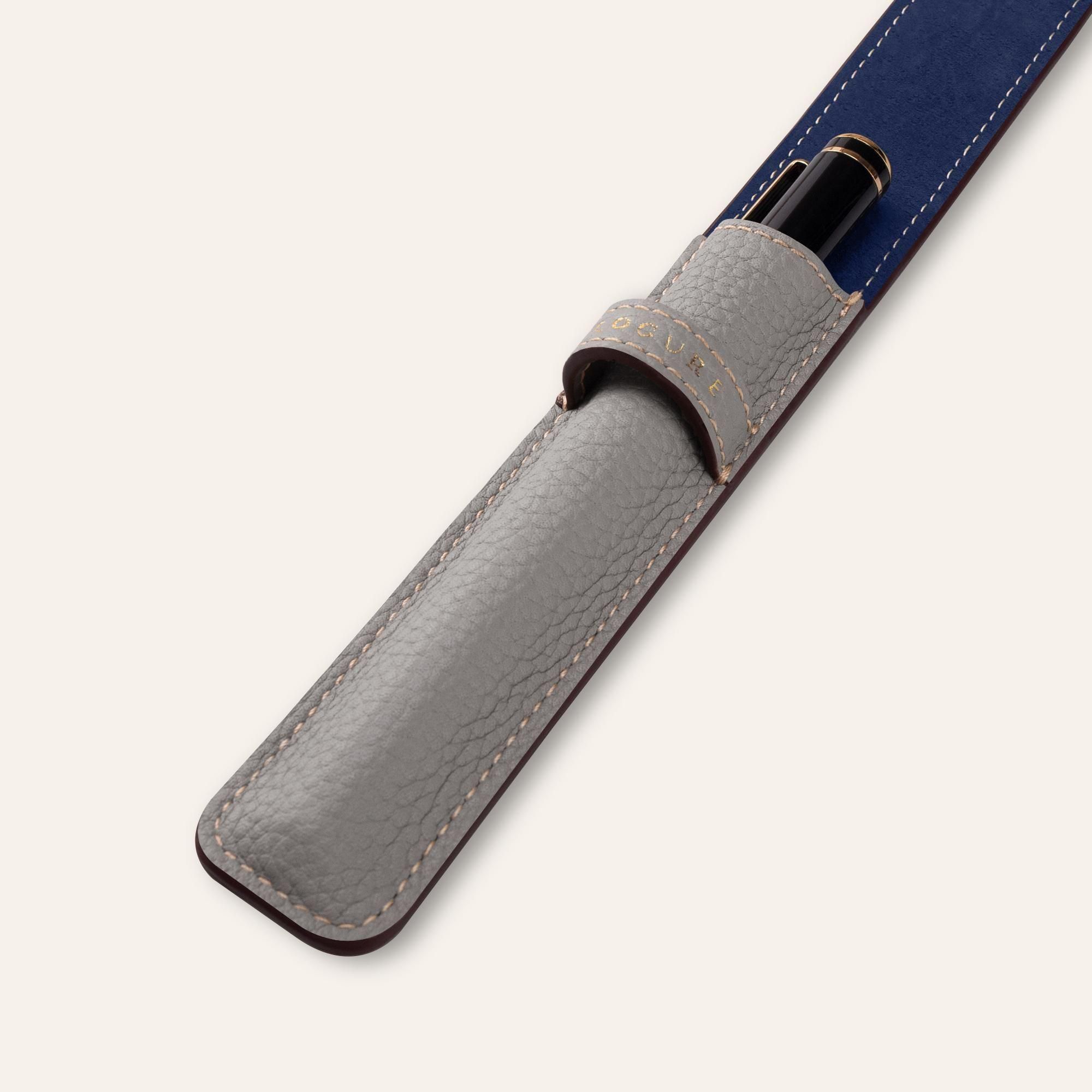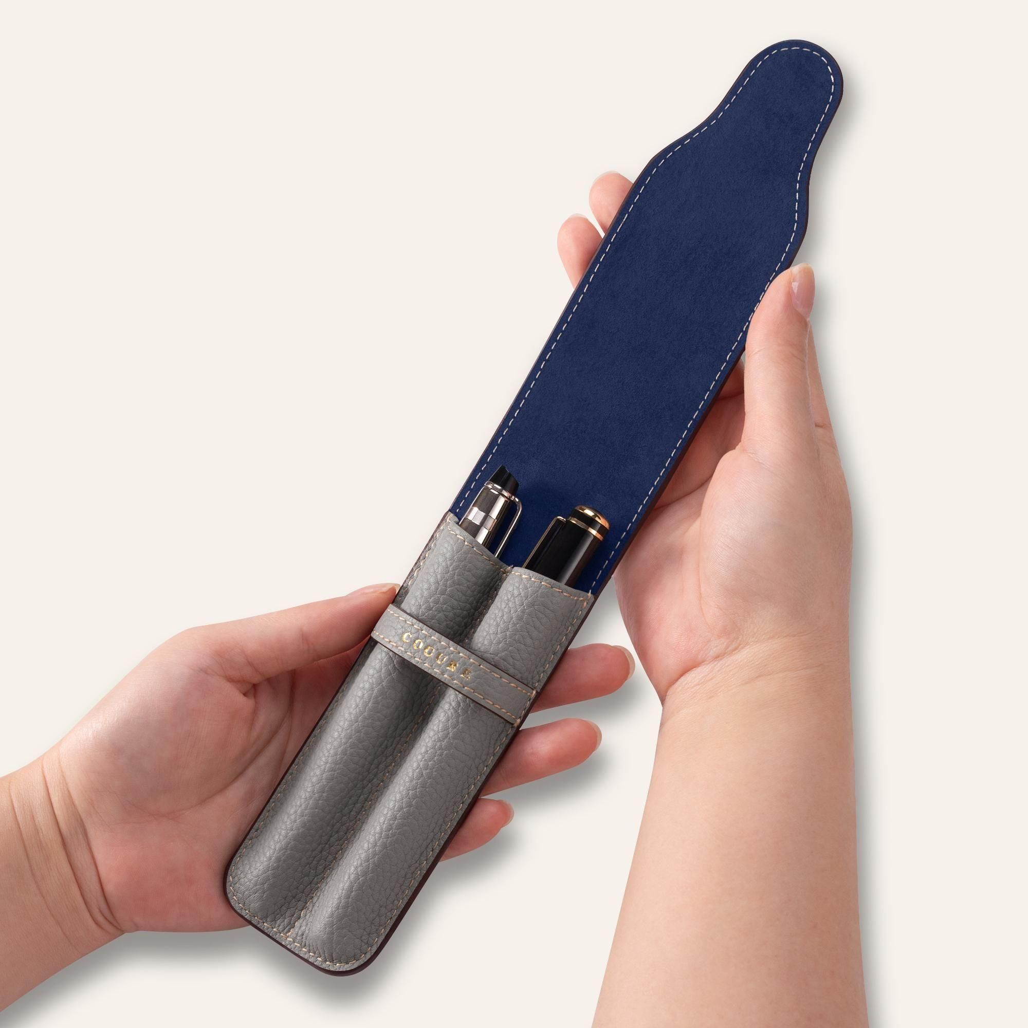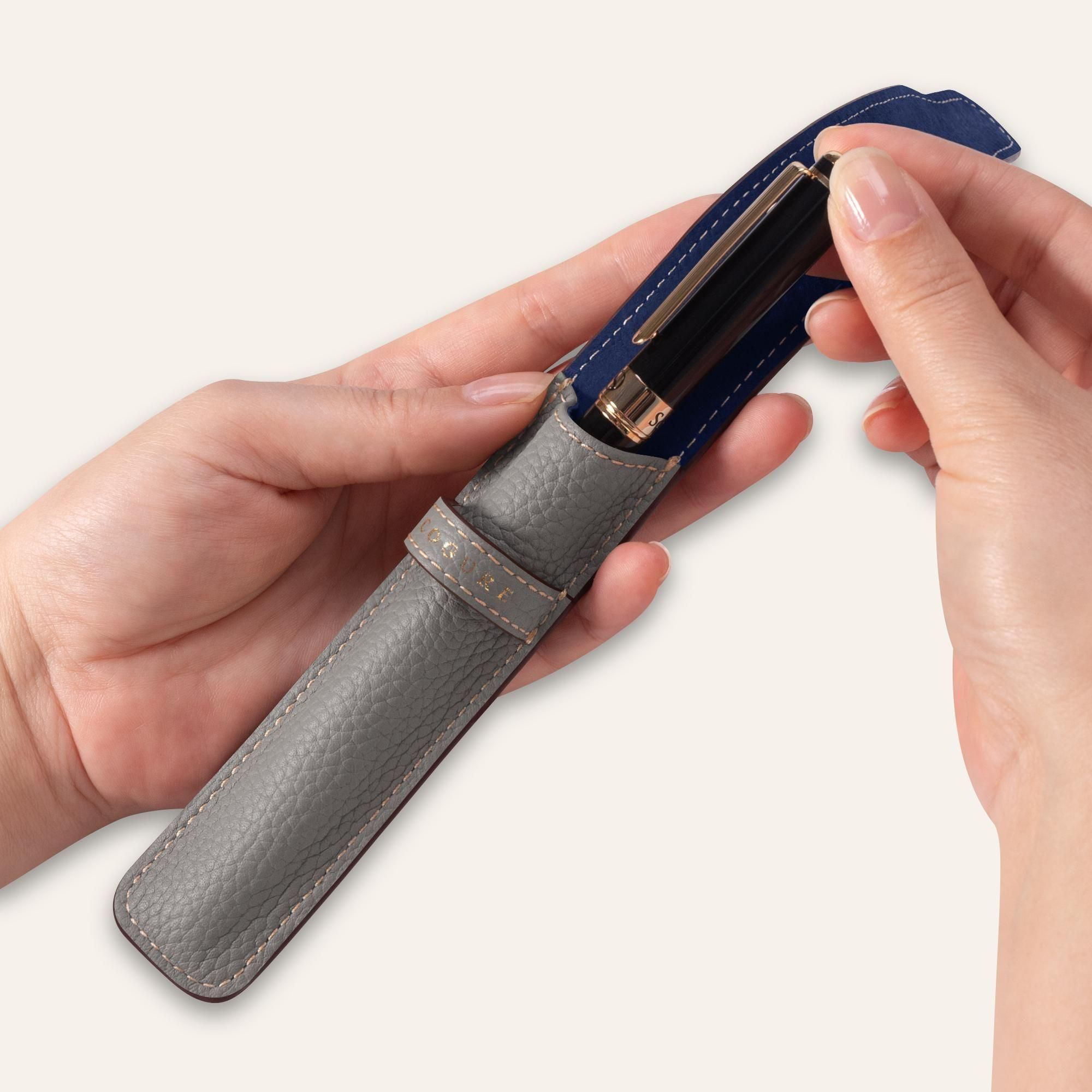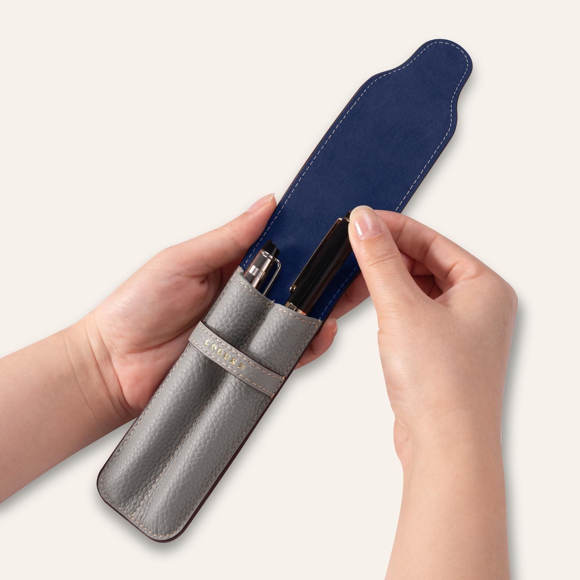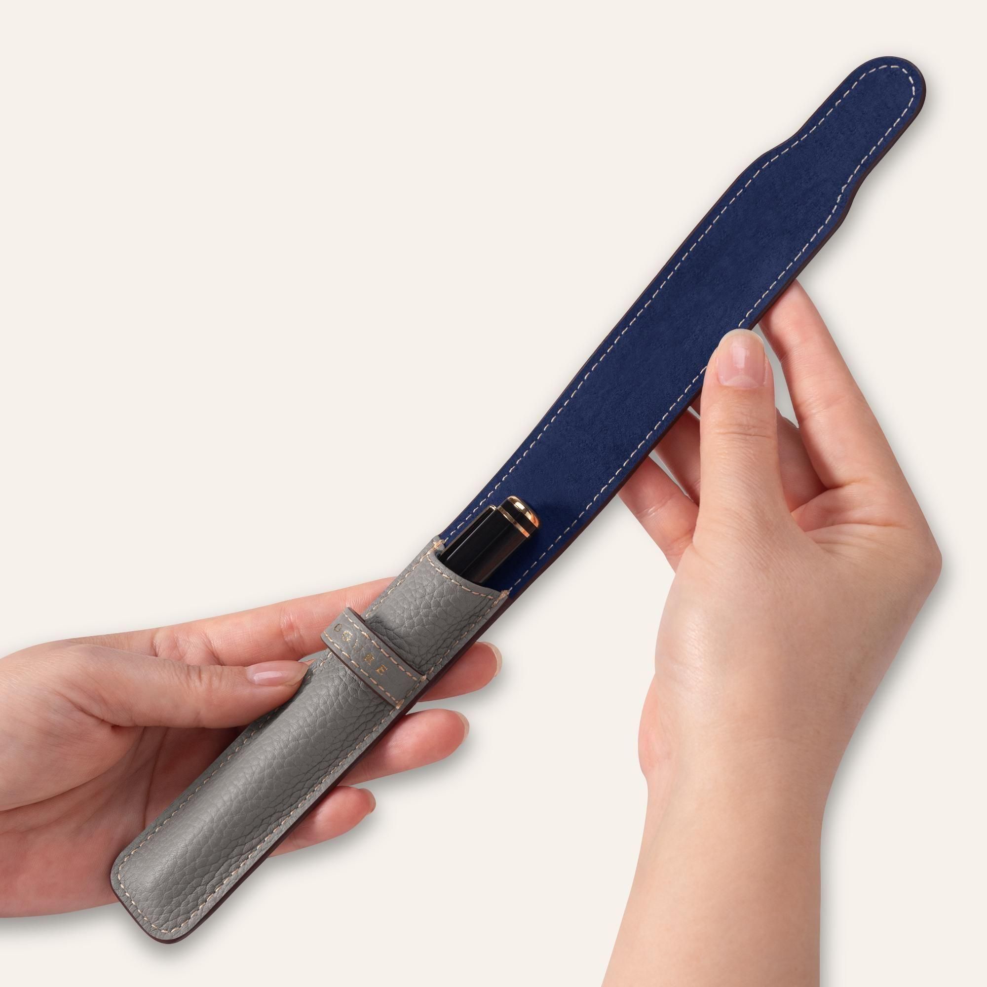 内装には、鮮やかなネイビーカラーのピッグスエードを贅沢に使用しています。柔らかな起毛が大切なペンを優しく傷から守り、外装のシュリンクカーフレザーとの美しいコントラストが、開くたびに洗練された印象と上質なサプライズを与えます。さらに、内装全体にピッグスキンを丁寧に張り合わせることで、しっかりとした構造と一層の上質感が生まれ、細部まで贅を尽くした仕上がりとなっています。