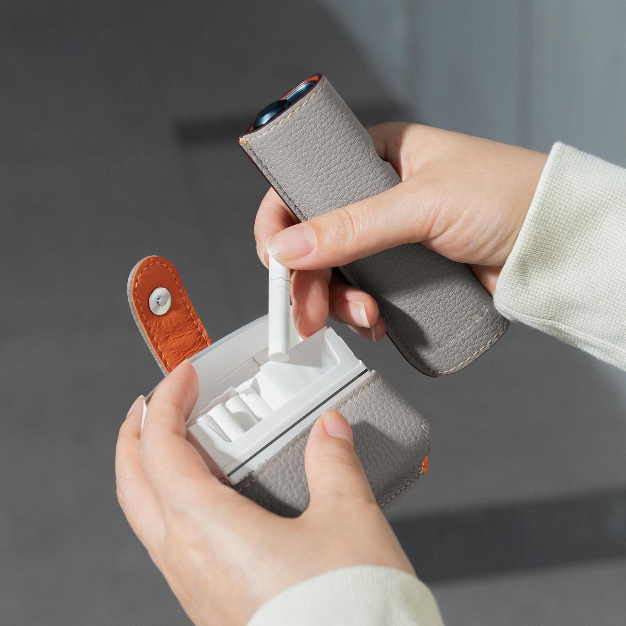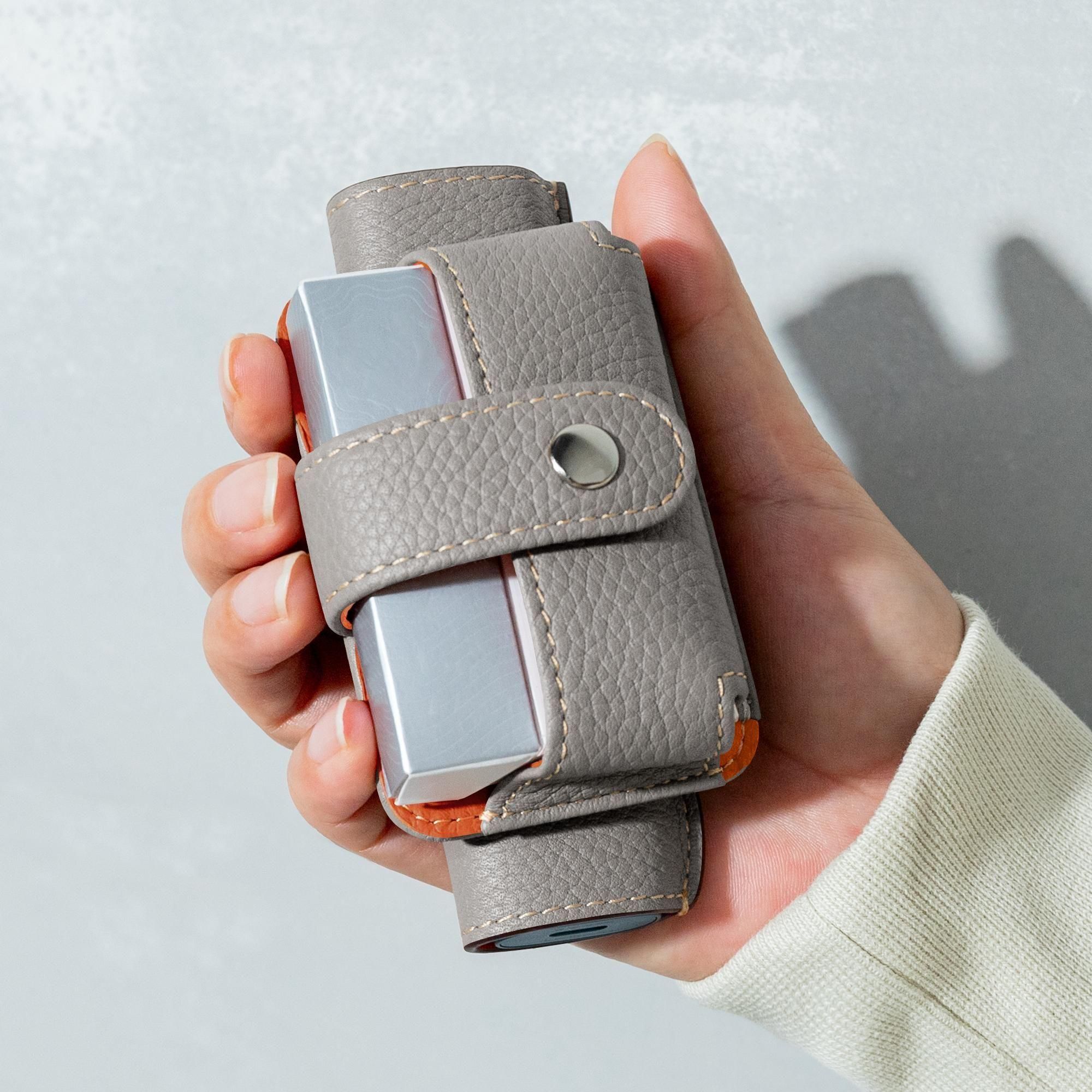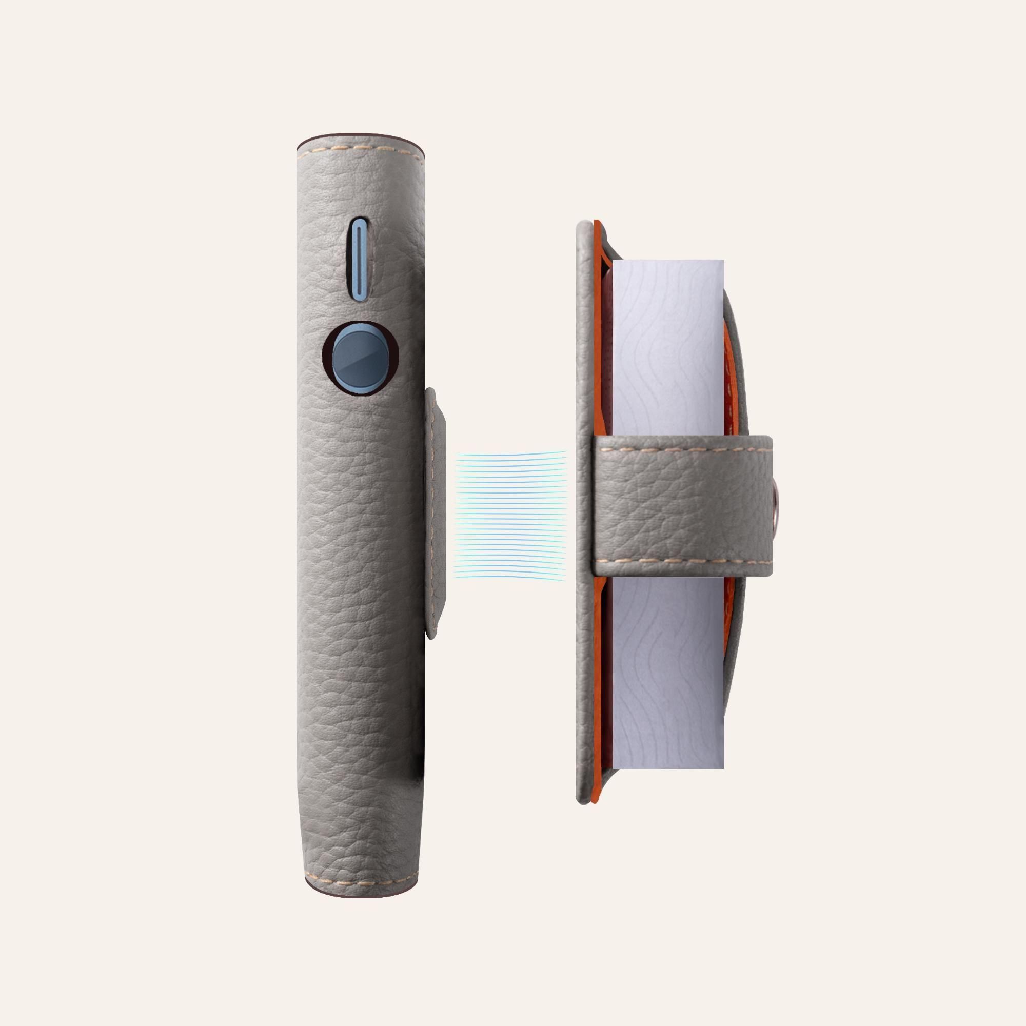 ヒートスティックの箱をそのまま収納できる、シンプルで機能的なデザイン。上質な本革に、内側のアクセントカラーが映える構成で、さりげない個性を演出します。箱の潰れや破損を防ぎ、スティックを常に美しい状態で持ち運び可能。開閉はマグネットホック式で、片手でもスムーズに扱えます。