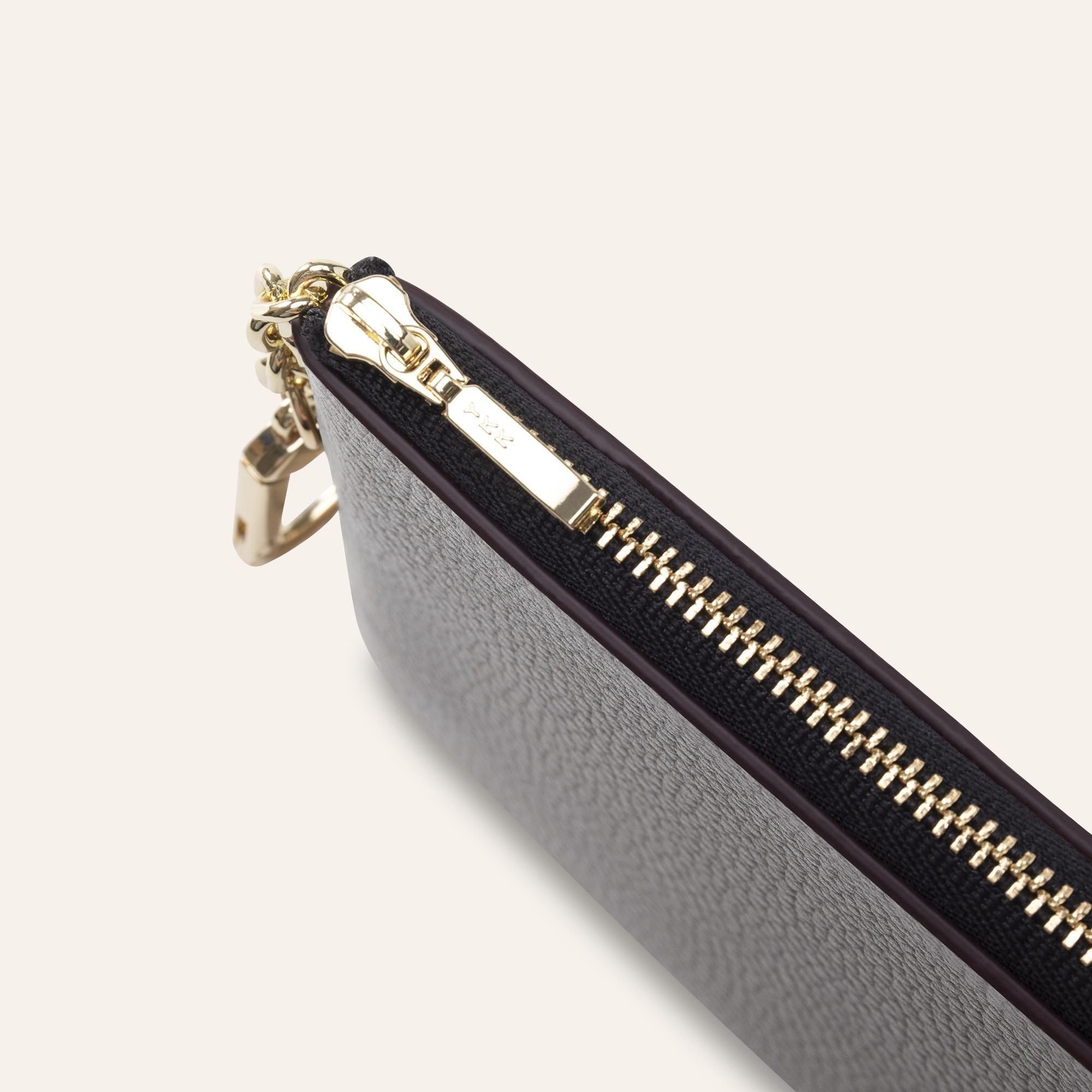 ファスナーには、信頼性の高いYKK社製金属ファスナーを使用。重厚感のあるブラックテープに、艶やかなゴールドエレメントを組み合わせ、ミニマルなデザインに奥行きと高級感を添えました。滑らかな開閉が、使うたびに上質な体験をもたらします。
